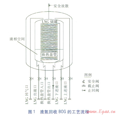 由于液氮在常壓下沸點約為-196℃,而LNG在常壓下沸點約為-162℃,液氮沸點溫度遠低于LNG沸點溫度,故可利用液氮的冷能對BOG重新液化。