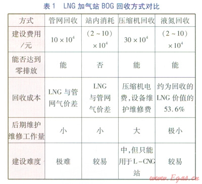 LNG加氣站BOG回收方式對比見表1。