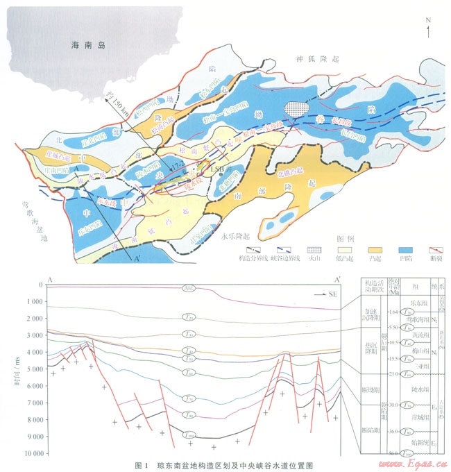 瓊東南盆地位于中國南海北部大陸邊緣,為新生代斷陷—坳陷盆地。具有準被動大陸邊緣盆地構(gòu)造特征,平面上則表現(xiàn)為南北分帶特征,由北至南可劃分為:北部坳陷、中部隆起、中央坳陷與南部隆起(圖1)。甕地經(jīng)歷由陸到海的演化過程,經(jīng)歷了斷陷期(T100—T70)、斷坳期(T70—T60)、熱沉降期(T60—T30)、加速沉降期(T30—現(xiàn)今)4個階段,整體可劃分為裂陷期(T100—T60)與裂后期(T60—現(xiàn)今)兩個時期,其絕對地質(zhì)年代如圖1所示,沉積了巨厚的新生代地層,厚度大于12000m[1-3]。