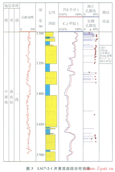 錄井成果顯示,LS17-2-1井在上新統(tǒng)鶯歌海組二段、上中新統(tǒng)黃流組一段具有氣測異常。其中,鶯歌海組二段氣測異常23m;黃流組一段氣測異常64m。