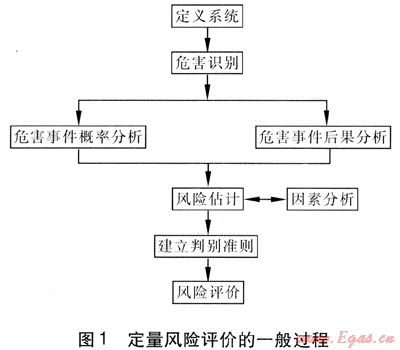 風(fēng)險(xiǎn)評(píng)價(jià)是以系統(tǒng)安全為目的,按照科學(xué)的程序和方法,對(duì)系統(tǒng)中的危險(xiǎn)因素、發(fā)生事故的可能性及損失與傷害程度進(jìn)行調(diào)查研究和分析論證,從而評(píng)價(jià)總體的安全性以及為制定基本預(yù)防和防護(hù)措施提供科學(xué)的依據(jù)[1]。風(fēng)險(xiǎn)評(píng)價(jià)按照定量的程度可以分為定性評(píng)價(jià)、半定量評(píng)價(jià)和定量評(píng)價(jià),定量風(fēng)險(xiǎn)評(píng)價(jià)是風(fēng)險(xiǎn)評(píng)價(jià)的高級(jí)階段。定量風(fēng)險(xiǎn)評(píng)價(jià)的一般過(guò)程見(jiàn)圖1[2]。