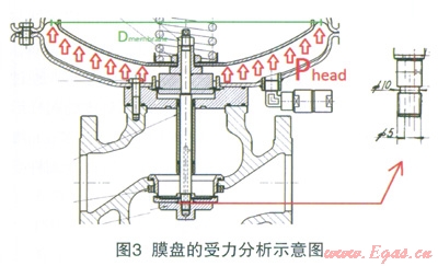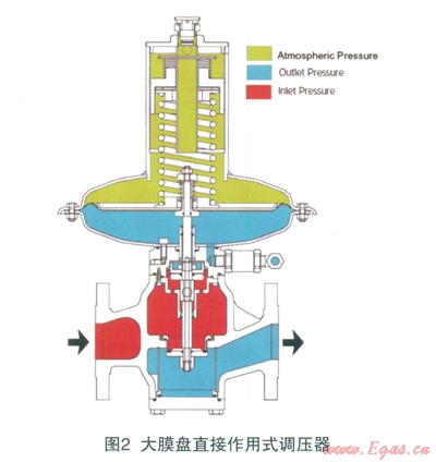該款調(diào)壓器為某進(jìn)口品牌,在我公司大量使用,其質(zhì)量和性能較為穩(wěn)定,一直沒有出現(xiàn)過問題。該款調(diào)壓器為大膜盤直接作用式調(diào)壓器,其連接口徑DN80,膜盤頭部直徑為書600,其結(jié)構(gòu)型式平衡閥芯式調(diào)壓器,閥瓣位于閥座下部,是典型的失效開啟型調(diào)壓器,在主皮膜破裂或壓力信號管無壓力反饋時(shí),閥口處于開啟狀態(tài)。大膜盤調(diào)壓器的特點(diǎn)是結(jié)構(gòu)簡單、響應(yīng)迅速、關(guān)閉精度高,由于大膜盤的作用,其關(guān)閉精度很高,當(dāng)下游壓力高于設(shè)定值時(shí),閥口關(guān)閉密封性好,無流量泄漏。其結(jié)構(gòu)見圖2。