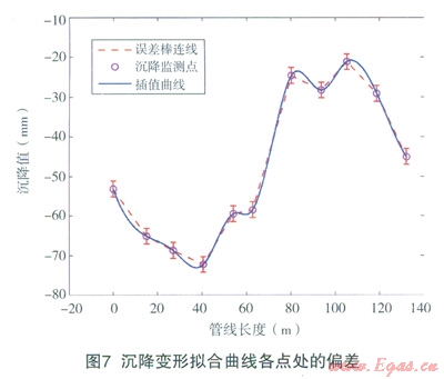 在本次試驗(yàn)中,由于監(jiān)測(cè)時(shí)間較短,在整個(gè)監(jiān)測(cè)時(shí)間段內(nèi)管道沒有發(fā)生大的實(shí)際變形,所以小的變形量就導(dǎo)致了比較大的相對(duì)誤差。為了考察大變形下誤差對(duì)計(jì)算結(jié)果的影響,不妨把管道的沉降測(cè)量值增大10倍。以第2個(gè)月的監(jiān)測(cè)值作為算例,利崩Matlab進(jìn)行30次的隨機(jī)數(shù)生成,其沉降變形擬合曲線的偏差范圍如圖7。
