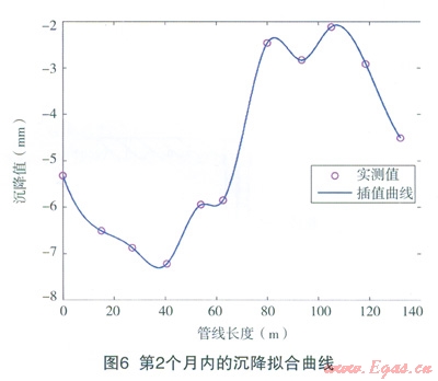 通過Matlab軟件,可容易地對(duì)沉降值進(jìn)行三次樣條擬合,以第2個(gè)月內(nèi)的沉降監(jiān)測(cè)點(diǎn)為例,進(jìn)行曲線插值擬合,結(jié)果曲線如圖6。