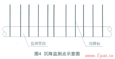 整個(gè)管道全長(zhǎng)132.1m,共設(shè)11個(gè)沉降監(jiān)測(cè)點(diǎn),按照均勻布置原則,并考慮現(xiàn)場(chǎng)實(shí)際情況,沉降監(jiān)測(cè)點(diǎn)之間的間隔為15m左右。如圖4所示。