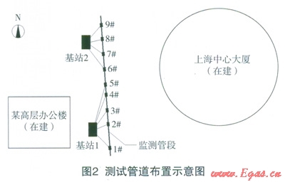 監(jiān)測(cè)管段位于上海中心大廈與另一座正在施工的建筑之間,屬于地面沉降危險(xiǎn)地段,為防止天然氣管道在建筑施工期間發(fā)生破壞,決定進(jìn)行天然氣管道的更換,9根試驗(yàn)管段也作為更新管道的一部分接入整個(gè)管線,監(jiān)測(cè)管道以及周同主要建筑物的相對(duì)位置如圖2所示。