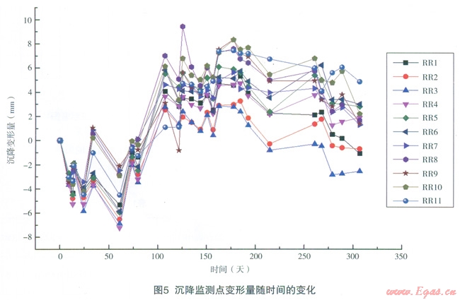 整個(gè)實(shí)驗(yàn)系統(tǒng)安裝完畢后即開始運(yùn)行,截至目前的300天時(shí)間內(nèi),沉降數(shù)據(jù)的采集頻率由人工操作,大約為20天1次,各沉降監(jiān)測(cè)點(diǎn)的監(jiān)測(cè)結(jié)果如圖5。