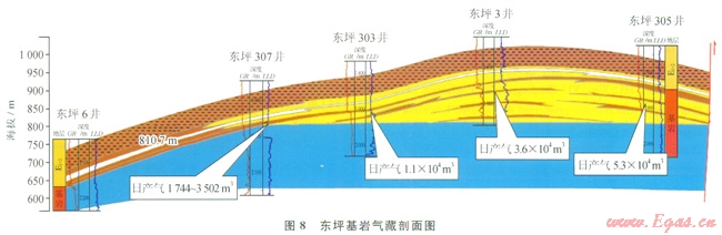 在流體識別、儲層參數(shù)計算、有效厚度確定的基礎(chǔ)上,通過多井對比,對氣藏有如下認識:基巖氣藏為雙重孔隙結(jié)構(gòu),氣藏內(nèi)部受裂縫發(fā)育,后期巖脈侵入等影響,縱向及平面上均表現(xiàn)出一定的非均質(zhì)性,北部的3井區(qū)和南部的l井區(qū)基巖段均為底水塊狀氣藏,基巖氣藏上部和側(cè)向與斷層下盤對接的地層為E1+2致密泥巖層及膏巖層,對厚層基巖氣藏起到了很好的封堵作用(圖8)。