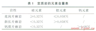 在巖心歸位的基礎(chǔ)上,利用不同巖性的數(shù)據(jù)點繪制中子密度交會圖,花崗片麻巖的樣本點落在砂巖線上或其上方,斜長片麻巖的樣本點在白云巖線上,鈣質(zhì)片麻巖的樣本點在石灰?guī)r線和白云巖線之間。元素俘獲譜測井可以得到地層中主要的元素含量,可用于化學(xué)成分不同的變質(zhì)巖的區(qū)分[6]。花崗片麻巖的石英長石含量高,暗色礦物含量低,因此元素俘獲譜上硅元素含量高,而鋁元素含量低;鈣質(zhì)片麻巖含有較多的碳酸鹽礦物,因此元素俘獲譜上鈣元素含量高、硅元素含量低;斜長片麻巖含有較多的角閃石等暗色礦物,因此元素俘獲譜上硅元素含量相對低而鋁元素含量相對高,不同巖性的元素含量如表1所示。
