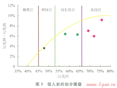 儲層巖性識別是油氣藏評價的前提和基礎(chǔ)工作,與常見的沉積巖不同的是基巖巖性復(fù)雜多變,測井識別困難。地面露頭踏勘和鉆井巖心分析表明東坪氣田的基巖包括火成巖和變質(zhì)巖兩大類巖性(圖1),北部3井區(qū)基巖以侵入巖為主,南部1井區(qū)以變質(zhì)巖為主。研究表明侵入巖主要為花崗巖,中間夾有輝綠巖、閃長玢巖的巖脈。變質(zhì)巖可分為3大類,分別為花崗片麻巖、斜長片麻巖和鈣質(zhì)片麻巖。侵入巖和變質(zhì)巖的區(qū)分可利用鉀和自然伽馬的交會圖(圖2)。由于侵入巖以鉀長石含量較高的花崗巖為主,其鉀含量和自然伽馬為相對高值,變質(zhì)巖的鉀和自然伽馬相對低值。因此侵入巖位于交會圖的右上角而變質(zhì)巖位于交會圖的左下方。利用元素俘獲譜資料實現(xiàn)兩大類巖性的細分。二氧化硅與氧化鈉和氧化鉀之和的交會圖(圖3)實現(xiàn)侵入巖的細分,花崗巖的二氧化硅含量高,為66%,輝綠巖為45%~53%,閃長玢巖為53%~66%。據(jù)此實現(xiàn)了北部3井區(qū)基巖儲層巖性的識別與劃分。變質(zhì)巖的種類繁多且其成因復(fù)雜,因而變質(zhì)巖的識別與劃分相對侵入巖要復(fù)雜得多。通常認為在變質(zhì)巖的形成過程中化學(xué)成分穩(wěn)定,這為利用元素俘獲譜測井劃分巖性提供了有利條件,同時由于礦物成分的不同其密度與中子值也有所不同。因此常規(guī)曲線對巖性的劃分也提供了好的資料。