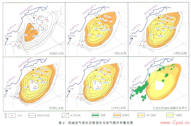 隨著地質(zhì)時(shí)間的推移,烴源灶范圍不斷擴(kuò)大,中心位置也逐漸由油源灶向氣源灶轉(zhuǎn)化。至今,大部分地區(qū)仍在供烴,靠近凹陷邊緣位置的烴源灶以生油為主,靠近凹陷中心位置的烴源灶以生氣為主,凹陷中心由于演化程度過高而不再生成油氣。這樣的烴源灶分布形成了油型氣與原油相伴生、油氣圍繞風(fēng)城組尖滅線環(huán)帶狀分布的特征。