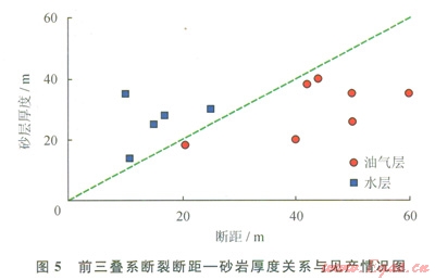 斷層是形成二疊系圈閉的重要封閉條件,克百地區(qū)斷層遮擋具有以下特征:①斷層較為古老,二疊紀(jì)后未活動(dòng),剖面上表現(xiàn)為未錯(cuò)斷上烏爾禾組蓋層;②延伸較長,斷距較大的斷層控制了主要油氣藏的形成;③呈弧形彎鹽的斷層易形成有效的圈閉和油氣藏。統(tǒng)計(jì)結(jié)果表明(圖5),當(dāng)前三疊系斷層斷距大于單砂層厚度時(shí)[19],利于形成上傾方向遮擋,如581井北斷裂、56l井北斷裂、克007井北斷裂、克80井西斷裂等,而當(dāng)斷層斷距小于單砂層厚度時(shí),不利于形成上傾方向遮擋。