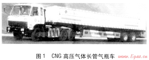 ① CNG高壓氣體長管氣瓶車(見圖1)由牽引車、高壓管道、半掛車(包括底盤、瓶組、安全倉、操作倉)等組成。高壓管道集裝箱的外部幾何尺寸符合國際標(biāo)準(zhǔn)12.2m(40英尺)集裝箱的要求,在充裝壓力達(dá)20MPa時可儲存CNG量4450m3。CNG高壓氣體長管氣瓶車適用于運輸?shù)缆穼掗?,路面質(zhì)量好的情況,一次性運輸量較多,可降低運輸成本。但它對運輸?shù)缆酚幸?,車輛的價格較高,在我國北方路況較好的地區(qū)使用較多。