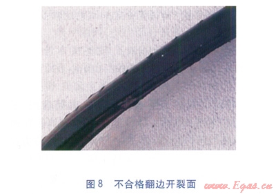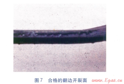 合格的判定:翻邊不開裂,或者即使開裂,開裂面是韌性開裂面(見圖7),判定為合格;翻邊發(fā)生開裂,并且開裂面是光滑平整的脆性開裂面(見圖8),判定為不合格。對于判定不合格的接頭需割除接頭重新焊接,如果不合格的數(shù)量較多,但翻邊脆性開裂長度小于25%,則應(yīng)該通過選取典型試件做拉伸性能試驗來最終確定該類焊接接頭是否合格。