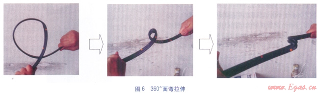 工程實踐中,我們通過與材料制造及熱熔連接設(shè)備廠家技術(shù)人員進行交流,發(fā)現(xiàn)采用360°的面彎并拉伸的方法(見圖6),可以將有質(zhì)量問題的翻邊檢驗出來。這種方法在最后拉伸時會在熔合面上形成很大的剪切力,比180°背彎更有效。