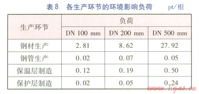 根據(jù)目標(biāo)距離法,可計(jì)算得到生產(chǎn)1根保溫管道的各環(huán)境影響類型的環(huán)境影響負(fù)荷及各生產(chǎn)環(huán)節(jié)的環(huán)境影響負(fù)荷(分別見(jiàn)表7、8)。將環(huán)境影響負(fù)荷的單位定義為環(huán)境負(fù)荷點(diǎn)(Point,簡(jiǎn)寫(xiě)為pt)。由于DN 500mm鋼管采用螺旋焊鋼管,能耗較低,因此環(huán)境影響負(fù)荷反而低于采用無(wú)縫鋼管(自動(dòng)軋管)的DN 200mm鋼管。