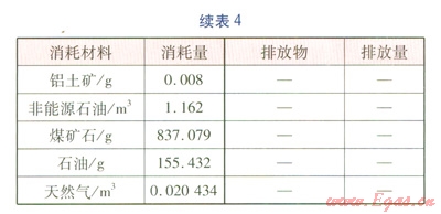 建材的含能(Embodied Energy)近年來(lái)在國(guó)外得到廣泛研究,含能是指產(chǎn)品從自然界原始材料的掘取,經(jīng)過(guò)運(yùn)輸、加工、組裝直至成品出廠前的所有相關(guān)過(guò)程的能耗總和,是基于生命周期的能耗統(tǒng)計(jì)數(shù)據(jù)。顧道金[14]利用國(guó)外含能數(shù)據(jù),建立了中國(guó)建筑產(chǎn)品外推含能數(shù)據(jù)表,并計(jì)算了我國(guó)能源使用背景下lMJ含能的生命周期數(shù)據(jù)清單。對(duì)于保溫層、外護(hù)管,在計(jì)算環(huán)境影響時(shí)都采用此種方法,生產(chǎn)1kg硬質(zhì)聚氨酯泡沫塑料保溫層、高密度聚乙烯外護(hù)管的生命周期數(shù)據(jù)清單(關(guān)鍵數(shù)據(jù))分別見(jiàn)表3、4。