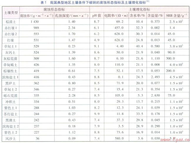 埋地鋼質(zhì)燃?xì)夤艿赖母g形態(tài)分為全面腐蝕、局部腐蝕兩類,全面腐蝕是指與土壤相接觸的管道表面均因腐蝕而受到損耗,以腐蝕率表示;局部腐蝕是指腐蝕的發(fā)生局限在結(jié)構(gòu)特定區(qū)域或部位上,以孔蝕深度進(jìn)行評價。本文給出的我國典型地區(qū)土壤對碳鋼的腐蝕形態(tài)指標(biāo)及土壤理化指標(biāo),來自埋沒于國內(nèi)20個典型地區(qū)土壤的碳鋼試驗件1a的腐蝕數(shù)據(jù)及土壤理化性質(zhì),實測數(shù)據(jù)與實際情況接近。