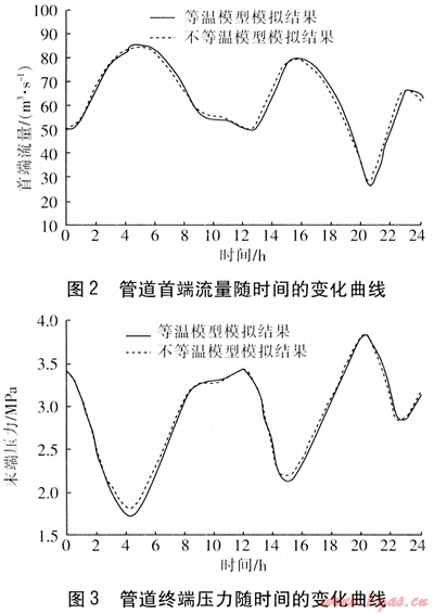 從不等溫模型模擬結(jié)果可以看出,管道終端溫度隨時間的變化較為劇烈,這是因為燃?xì)庠诠艿乐辛鲃訒r,其溫度、流量、壓力相互關(guān)聯(lián)、相互影響,即受焦耳-湯姆遜效應(yīng)的影響,在流量隨時間變化較大時,壓力變化較大,溫度的變化也較劇烈,溫度隨流量的增大而降低,隨壓力的增大而升高。