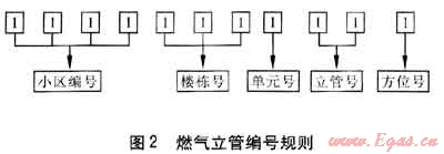 為了更好地對立管進行管理,對立管進行有規(guī)則的編號顯得非常必要。編號可與客服管理系統(tǒng)相結(jié)合,公司依據(jù)客服管理系統(tǒng)以及立管情況進行編號。燃氣立管編號規(guī)則見圖2。