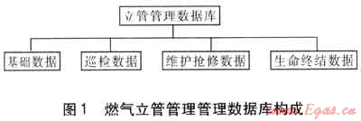 燃氣立管管理是以燃氣引入管數(shù)據(jù)為基礎的。我們在城市民用燃氣立管的管理項目實施前以及實施過程中收集了大量的基礎數(shù)據(jù),以此建立基礎數(shù)據(jù)庫;依據(jù)在運行過程中因管道日常巡查、維修、更換、事故搶修等而產(chǎn)生的運行數(shù)據(jù),建立運行數(shù)據(jù)庫。通過開發(fā)專業(yè)的立管管理軟件將上述兩個數(shù)據(jù)庫資源進行整合,形成一個完整的燃氣立管管理數(shù)據(jù)庫。工作人員運用該專業(yè)管理軟件對基礎數(shù)據(jù)、日常巡查數(shù)據(jù)以及維護、更換、事故搶修事故數(shù)據(jù)進行處理、分析,得出分析結(jié)果,依據(jù)分析結(jié)果采取相應的響應措施,并將數(shù)據(jù)進行更新,不斷補充、完善整體數(shù)據(jù)庫[2]。立管管理數(shù)據(jù)庫系統(tǒng)構(gòu)成見圖1。