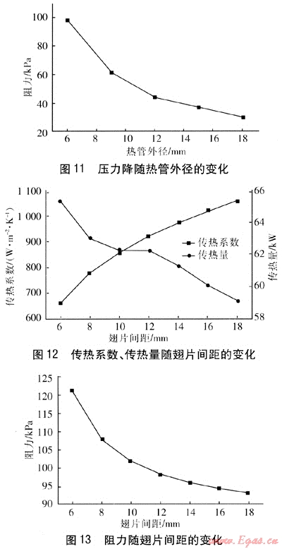 ② 翅片厚度對熱管的傳熱系數(shù)和傳熱量影響很小,但對阻力影響較大,在機(jī)械強(qiáng)度、工藝及使用壽命允許的前提下應(yīng)盡可能選擇較薄的翅片。