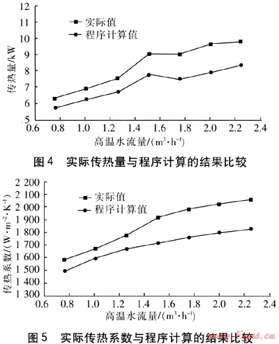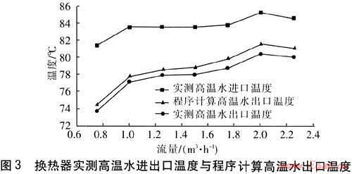 換熱器高溫水進(jìn)出口溫度與程序計(jì)算高溫水出口溫度見圖3。由圖3可知,當(dāng)高溫水流量在0.75~2.25m3/h變化時,實(shí)測的高溫水出口溫度與程序計(jì)算值的變化趨勢基本是一致的,但實(shí)測值比程序計(jì)算值低,即換熱器的實(shí)際傳熱量比程序計(jì)算的高。