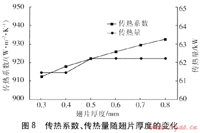 在翅片間距為10mm、蒸發(fā)側(cè)、冷凝側(cè)長度分別為100mm、熱管外徑為6mm、熱管壁厚為0.5mm、熱管間距為8.5mm時,機(jī)油冷卻器性能隨翅片厚度的變化見圖8、9。由圖8可知,隨著翅片厚度增加,傳熱系數(shù)有少許增加,傳熱量基本不受影響。這是由于翅片厚度增加使得機(jī)油的流通面積減小,流速增加,傳熱系數(shù)也隨之增大。同時傳熱面積減少,傳熱量變化不大。由圖9可知,隨著翅片厚度的增加,機(jī)油流通面積減小,機(jī)油的流速增加,因此蒸發(fā)側(cè)的阻力增大。