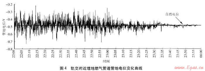 以管道未受干擾時(shí)的自然電位為基準(zhǔn),雜散電流流入?yún)^(qū),管地電位負(fù)向偏移,管道處于陰極區(qū)受到保護(hù);雜散電流流出區(qū),管地電位正向偏移,管道為陽(yáng)極區(qū)發(fā)生腐蝕,必須采取防護(hù)措施。對(duì)于動(dòng)態(tài)雜散電流干擾,管道陰極區(qū)和陽(yáng)極區(qū)分布是動(dòng)態(tài)變化的,管道某點(diǎn)可能處于雜散電流流入、流出交替變化中,為管道雜散電流腐蝕判定及防護(hù)帶來(lái)一定的困難。對(duì)上海市某軌道交通旁的埋地燃?xì)夤艿拦艿仉娢贿M(jìn)行實(shí)時(shí)監(jiān)測(cè),變化如圖4,測(cè)試過(guò)程中將犧牲陽(yáng)極斷開(kāi),以軌交停運(yùn)后管地電位平均值作為自然電位。在軌交運(yùn)行期間多列機(jī)車通過(guò)測(cè)試點(diǎn),管地電位相對(duì)自然電位正負(fù)交替變化,電位正向和負(fù)向偏移均比較明顯。