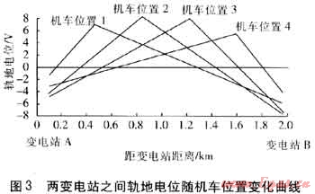 雜散電流的變化與雜散電流源的變化具有一致性,軌交雜散電流的大小隨軌交系統(tǒng)的用途、機(jī)車的相對(duì)位置和運(yùn)行狀態(tài)不同而變化。機(jī)車在每?jī)蓚€(gè)站臺(tái)之間都要經(jīng)歷加速、勻速、減速的過(guò)程,不同運(yùn)行狀態(tài)下機(jī)車電流不同。隨機(jī)車電流及機(jī)車位置的變化,軌道電流和軌道對(duì)地電位(簡(jiǎn)稱軌地電位)也處于變化中,圖3為兩變電站之間軌地電位隨機(jī)車位置變化曲線。軌地電位為正時(shí),雜散電流流入大地,軌地電位為負(fù)時(shí),雜散電流返回鋼軌。鋼軌泄漏電流位置的變化使得埋地管道對(duì)地電位(簡(jiǎn)稱管地電位)處于不斷變化之中,管道發(fā)生雜散電流腐蝕的位置和強(qiáng)度也在不斷變化[8]。