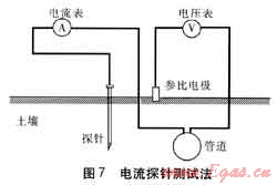 管內(nèi)電流測(cè)量在埋地管道檢漏、防腐層破損檢驗(yàn)等方面有良好的應(yīng)用,但由于受測(cè)試精度、陰極保護(hù)電流等影響,國(guó)內(nèi)還沒(méi)有依據(jù)管內(nèi)電流變化進(jìn)行雜散電流干擾判定的相關(guān)標(biāo)準(zhǔn)。歐洲標(biāo)準(zhǔn)EN 50162—2004《直流系統(tǒng)中雜散電流引起腐蝕的防護(hù)》(《Protection Against Corrosion by Stray Current from Direct Current Systems》)(以下簡(jiǎn)稱EN 50162標(biāo)準(zhǔn))推薦一種電流探針測(cè)試法對(duì)有陰極保護(hù)結(jié)構(gòu)所受雜散電流干擾進(jìn)行判定,測(cè)量原理見(jiàn)圖7。探針表面具有良好絕緣防護(hù),僅頭部有裸露金屬表面,裸露表面相當(dāng)于絕緣金屬表面的一個(gè)漏點(diǎn)。將探針插入土壤并使探針頭部與管道中心線位于同一深度,用電流表記錄管道和探針之間電流的方向和大小,考慮到導(dǎo)線電阻對(duì)電流測(cè)試的影響,探針與管道應(yīng)盡量接近,通過(guò)測(cè)量探針與管道之間電流的變化來(lái)反映雜散電流的干擾。在電流測(cè)試同時(shí)可進(jìn)行管地電位測(cè)量(地表參比法管地電位測(cè)試),對(duì)管道陰極保護(hù)效果進(jìn)行評(píng)估。
