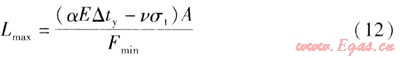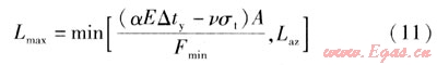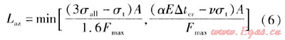 在該區(qū)域內(nèi),管道循環(huán)溫差高于最大允許循環(huán)溫差,因此不允許管道進(jìn)入錨固狀態(tài),且在計(jì)算安裝長度時,需考慮彈性狀態(tài)和局部穩(wěn)定的需要,得到管道的最大允許安裝長度,見式(6)。