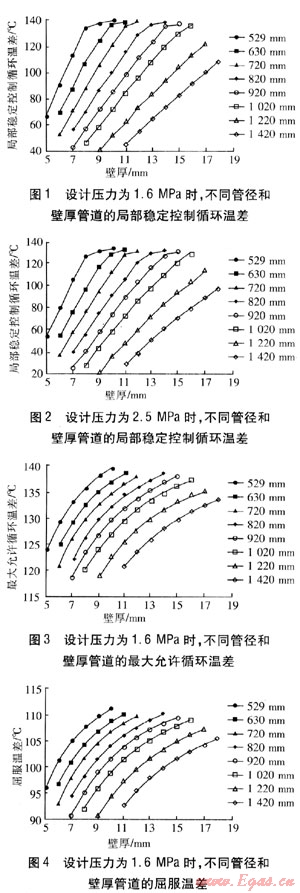 設(shè)計(jì)壓力為1.6MPa和2.5MPa時,不同管徑和壁厚管道的局部穩(wěn)定控制循環(huán)溫差見圖1、2。