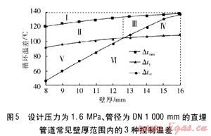 以設(shè)計(jì)壓力為1.6MPa、管徑為DN 1000mm的直埋管道為例,常見壁厚范圍內(nèi)的3種控制溫差見圖5。由圖5可知3種控制溫差的相對關(guān)系,管道的工作狀態(tài)被劃分為6個區(qū)域(Ⅰ~Ⅵ區(qū))。本文對每個區(qū)域管道的工作狀態(tài)進(jìn)行分析。