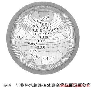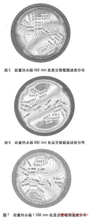 真空管(長(zhǎng)度為1800mm)與蓄熱水箱連接處以及距蓄熱水箱450、900、1350mm處的真空管截面速度分布分別見圖4~7,圖中數(shù)值單位均為m/s。由圖4~7可知,沿著遠(yuǎn)離蓄熱水箱方向,真空管內(nèi)冷熱流體的速度先增大后減小,在距蓄熱水箱450mm處速度最大。說明在距蓄熱水箱450mm這段真空管內(nèi)存在冷熱流體的回流混合,造成熱損失,降低了集熱系統(tǒng)的效率,采用引流擋板可以在一定程度上解決該問題[11]。