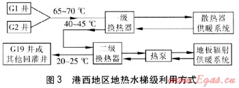 ① 港西地區(qū)新建建筑首選地?zé)崴?。目前,港西地區(qū)G1、G2、G19井待用,地?zé)崴捎锰菁壚梅绞?。港西地區(qū)地?zé)崴菁壚梅绞揭妶D3。采用溫度為65~70℃的G1、G2井地?zé)崴?jīng)一級換熱器加熱散熱器供暖系統(tǒng)供水,地?zé)崴疁囟冉抵?0~45℃。然后經(jīng)二級換熱器為熱泵提供熱量,熱泵制取熱水后供地板輻射供暖系統(tǒng)。尾水溫度為20~25℃,回灌到G19井或其他回灌井。