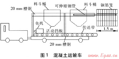 根據(jù)隧道的內(nèi)徑大小,現(xiàn)場制作混凝土運(yùn)輸車,見圖1。受電機(jī)車的運(yùn)載能力和空間限制,運(yùn)輸車一次可運(yùn)輸4m3的混凝土,可澆筑墊層長度為3m;可同時運(yùn)輸鋼筋籠、預(yù)埋件和混凝土,在運(yùn)輸鋼筋籠時伸長可伸縮鋼管,將鋼筋籠掛在上面,鋼筋籠的長度為1.5m,將預(yù)埋件固定在裝滿混凝土的料斗桶內(nèi)?;炷恋拇怪边\(yùn)輸采用起重量為100kN的龍門吊,吊筒采用漏斗型開閉式,容積為1.5~2.0m3。混凝土在隧道內(nèi)的水平運(yùn)輸采用牽引力為150kN的軌道電機(jī)車牽引一臺混凝土運(yùn)輸車。