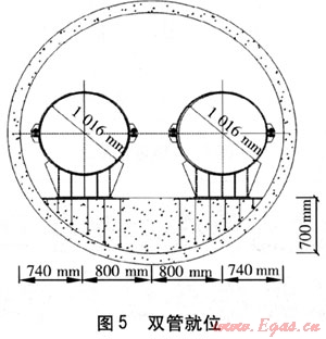 某工程盾構(gòu)隧道長1400m,隧道斷面為圓形,內(nèi)徑為3.08m,始發(fā)井為直徑為12m、深25m的圓柱形豎井,接收井為直徑為12m、深15m的圓柱形豎井。根據(jù)設(shè)計(jì)要求,圓柱形隧道底部澆筑高700mm的混凝土墊層,墊層上并行敷設(shè)兩條外徑為1016mm的管道。管道全部安裝在滑動支架上,每隔12m設(shè)置1個滑動支架,滑動支架滿足承重和抗浮的要求。