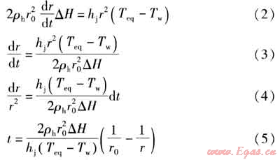 由以上分析可知,首先在液-液分界面處形成一個球形水合物膜層,水和客體物質(zhì)分別通過水合物膜層向兩側(cè)擴散以便相互接觸,促進水合物的生長。假設(shè)此時水合物向兩側(cè)的生長率相同,即rh=r0+dr,rb=r0-dr,當(dāng)t=0時,r=r0,則由式(1)得到式(2)~(5)。