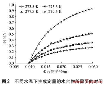 以制冷劑HCFC-141b作為客體物質(zhì)進行計算,計算中取HCFC-141b的量為1mol。計算得知初始時刻r0為9.7mm,依據(jù)理論參數(shù),計算了不同水溫下生成定量水合物所需要的時間,見圖2。