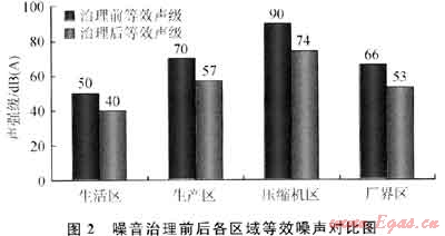 從圖2可以看出,X站壓縮機(jī)所產(chǎn)生的噪聲值經(jīng)治理后明顯降低,其中廠界區(qū)和生活區(qū)的噪聲值都在55dB(A)以下,達(dá)到了國家3類聲環(huán)境功能區(qū)的夜間排放標(biāo)準(zhǔn)。