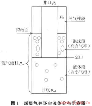 對(duì)于含氣量相對(duì)較高且具有一定穩(wěn)產(chǎn)能力的煤層氣井,可以將環(huán)空內(nèi)的流體劃分為純氣柱段、混氣液柱段(泡沫段和普通液氣段),如圖1所示。由于泡沫段的存在,使得擬液面的位置反映為泡沫段的上端面,環(huán)空液面往往并不能真實(shí)地反映煤層氣井的井底流壓,真實(shí)液面位置必須通過測(cè)試的擬液面與泡沫段長(zhǎng)度進(jìn)行修正。