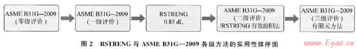 新版ASME B31G—2009標(biāo)準(zhǔn)延續(xù)并完善了原始的ASME B31G評(píng)價(jià)方法,其最大的變化是采用分級(jí)評(píng)價(jià)的理念,由保守到精確,由粗略到精細(xì),層層深入。評(píng)價(jià)共分為4個(gè)等級(jí),各個(gè)等級(jí)之間不是孤立存在的,而是按照實(shí)際操作的難易程度、評(píng)價(jià)結(jié)果的精確性和保守性而制定的由初級(jí)到高級(jí)的評(píng)價(jià)原則。有利于評(píng)價(jià)人員根據(jù)現(xiàn)場(chǎng)操作難易程度、資料詳細(xì)程度以及評(píng)價(jià)精度等要求選擇不同的評(píng)價(jià)等級(jí)進(jìn)行操作,大大提高了工作效率和評(píng)價(jià)結(jié)果的精確度,具有很強(qiáng)的實(shí)際應(yīng)用價(jià)值。