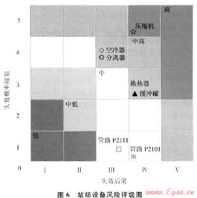 2) 注采氣站風險評估結果表明:壓縮機系統(tǒng)和處理系統(tǒng)風險遠遠大于管路系統(tǒng)風險,其中壓縮機組最大;處理系統(tǒng)設備中空冷器風險最大,其次是緩沖罐(壓縮機出口)、過濾分離器和旋流分離器(圖5);而管路系統(tǒng)中對帶壓的34條管線中,從壓縮機出口到緩沖罐出口的管線P2112~P2118風險最大,其中P2113最大,管路系統(tǒng)風險值大主要是由于壓力和溫度相對較高引起的。采用風險矩陣對各類設備或管路風險定級可知:壓縮機風險為高風險,而管路系統(tǒng)均為中低風險(圖6)。通過風險排序,明確了高風險單元,即可采用HAZOP法進行詳細風險分析。
