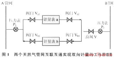 圖1是兩個天然氣管網(wǎng)互聯(lián)互通實(shí)現(xiàn)雙向計量的工作原理圖。