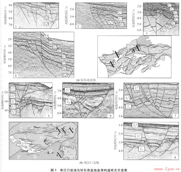 2) 受盆地動力學(xué)機(jī)制影響,盆地構(gòu)造樣式可以劃分為伸展構(gòu)造樣式、走滑構(gòu)造樣式及重力構(gòu)造樣式。每一種構(gòu)造樣式均反映了不同的動力學(xué)背景。其中伸展構(gòu)造樣式在盆地內(nèi)占主要地位,走滑構(gòu)造樣式及重力構(gòu)造樣式主要分布于盆地局部。