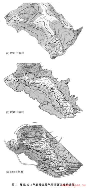 表1是1990年、1997年和2003年解釋的陵三段氣層頂(T62)、底(T70)構(gòu)造要素對(duì)比表。這幾次解釋的構(gòu)造走向均為北西 南東向(圖1),然而解釋的氣層頂面構(gòu)造圈閉面積、構(gòu)造幅度和最低圈閉線(xiàn)均有一定程度的變化,但在BP01資料基礎(chǔ)上研究得到的構(gòu)造圖在實(shí)鉆井深度、橫向壓力變化和氣水界面等方面均與實(shí)際資料最為吻合。