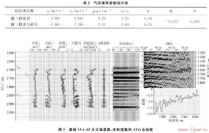為了確定崖城13-1氣田陵三段的AV0類(lèi)型,首先從理論出發(fā)統(tǒng)計(jì)了井上的氣層及上覆地層的屬性參數(shù),包括縱橫波速度、密度、泊松比等參數(shù),并通過(guò)Shuey’s的簡(jiǎn)化Zoeppritz方程計(jì)算了反射系數(shù),發(fā)現(xiàn)氣層頂面的反射系數(shù)大,而泊松比變化較小(表2),滿(mǎn)足產(chǎn)生第Ⅳ類(lèi)異常的條件;接著選擇代表性的井(A5井)進(jìn)行了正演模擬,模擬結(jié)果顯示該井正演道集的氣層頂面均對(duì)應(yīng)波谷(負(fù)反射系數(shù)),并且隨著偏移距的增加振幅有減弱的跡象;隨后對(duì)實(shí)際的地震道集進(jìn)行了AV0分析(圖3),從實(shí)際道集中提取的氣層頂面AV0曲線(xiàn)表明:在偏移距200~4500m的變化范圍內(nèi),反射系數(shù)均為負(fù)值,并且其絕對(duì)值隨著偏移距的增多而減小,證實(shí)了該氣藏的Ⅳ類(lèi)AV0特征。另外,在沒(méi)有鉆井的地方也對(duì)實(shí)際地震道集進(jìn)行了AV0分析,均顯示為Ⅳ類(lèi)AV0特征。