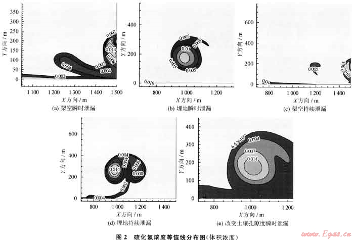 圖2為泄漏80s后硫化氫濃度分布。對比圖1、2可知,硫化氫濃度等值線分布形狀幾乎與甲烷濃度分布相同。這是由于甲烷和硫化氫出泄漏口時均勻混合,在擴散過程中受到的影響因素相同,等值線分布重合。