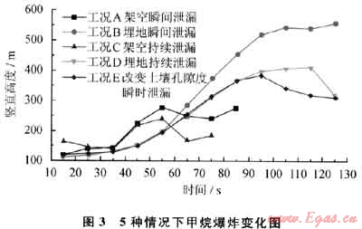 3) 管道泄漏爆炸范圍:埋地管道(工況B、D、E)泄漏爆炸范圍大且影響時間長,呈指數(shù)增加達到一定高度后不再升高,隨氣體擴散濃度減低至爆炸下限外;架空瞬間及持續(xù)泄漏爆炸范圍在85s前增加且高度比埋地管道泄漏高,85s后降低;孔隙度越大其影響范圍越小。